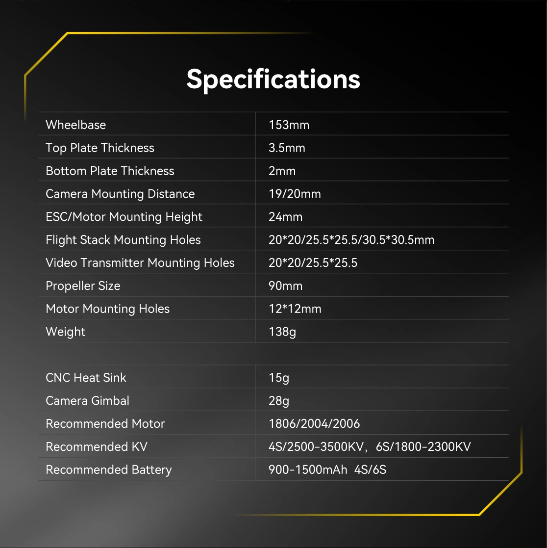 Compatible with video transmitters.The standard version supports various HD and analog video transmitter installations in 2020 | 25.525.5 (45° 90°) formats.For installing LINK or O3 video transmitters, it is recommended to use an all-in-one (aio) flight controller. If you plan to install a flight stack, it is advisable to use the pro version.Note: BEE35 comes with a carbon fiber bottom plate. BEE35 PRO comes with an aluminum alloy heat sink bottom plate.